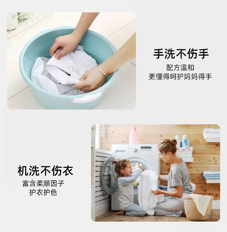 · 配方温和,不伤手不伤衣物, 富含柔顺因子,护衣护色